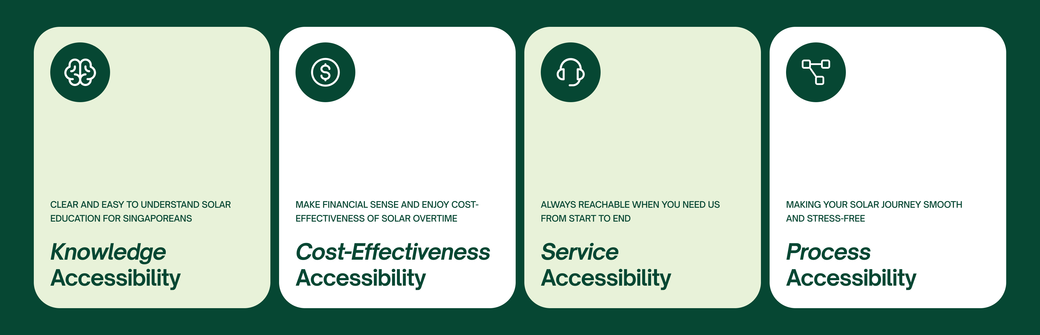 To stand out, we need to keep it simple, accessible, and empowering. Hence, we positioned Energio as a solar partner for Singapore homeowners who want to invest in solar but feel lost in the complexity and unreliable information. Energio makes everything accessible with guidance, transparent expertise, and support that evolves with customers throughout their entire solar journey. For Energio, there are four core accessibilities to solar: Knowledge accessibility, cost-effectiveness accessibility, service accessibility, and process accessibility.