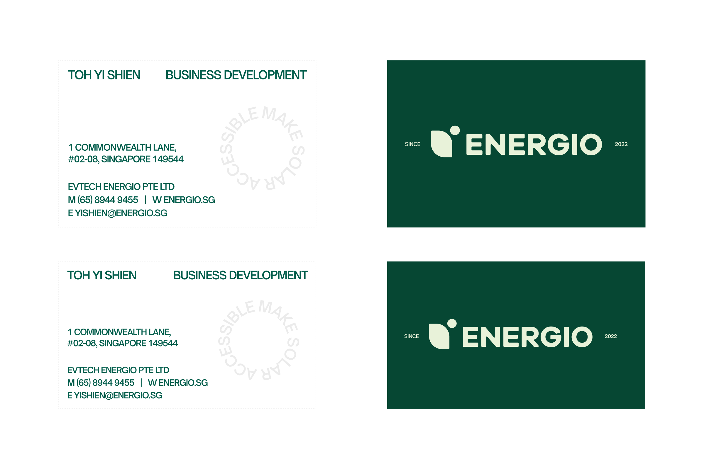 A vibrant energy-inspired colour palette and modern typography reinforced trust, clarity, and momentum. These elements were extended across key touchpoints, including the website, portfolio showcases, FAQs, business cards, and environmental signage. The website was designed to answer real questions, show real results, and make the journey to solar adoption feel simple and guided rather than intimidating. The result is a unified brand that does more than sell solar installations. Energio now shows up with a clear voice and a clear promise: to make solar accessible for homeowners and corporates, today and in the years ahead.